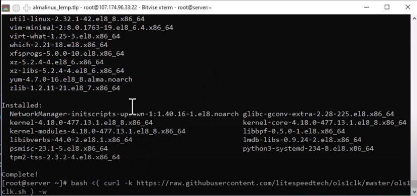 This command automatically downloads and runs the OLS1CLK (OpenLiteSpeed One-Click) installer.