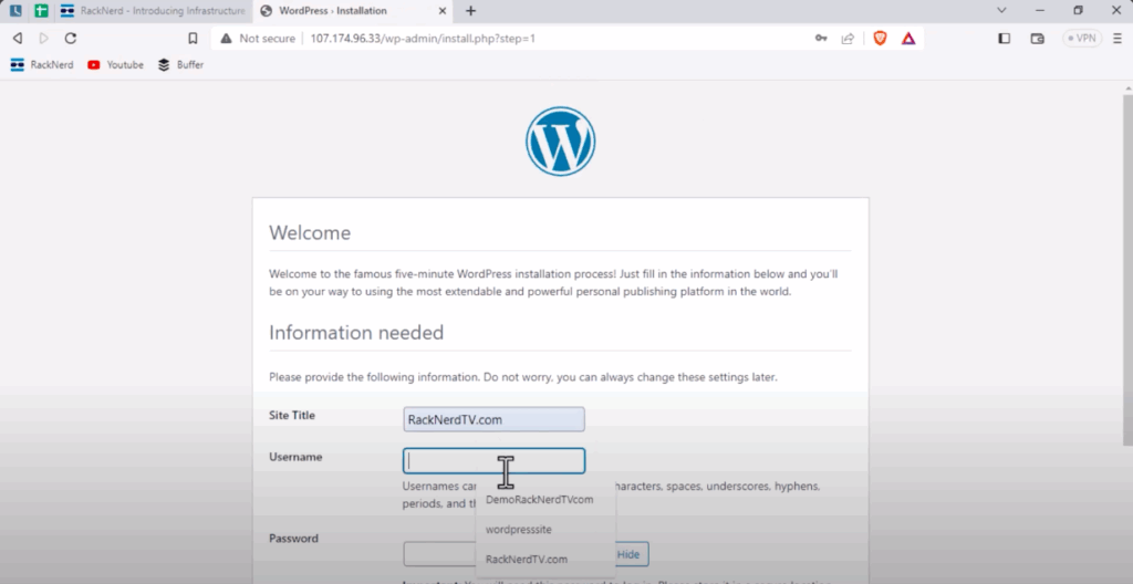 Here you’ll be asked to create your WordPress admin account, choose a password, and set your site title.