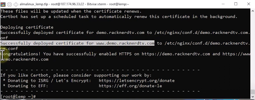 Congratulations! You’ve successfully installed a Free AutoSSL certificate using Let’s Encrypt by CertBot on a LEMP stack running AlmaLinux OS.